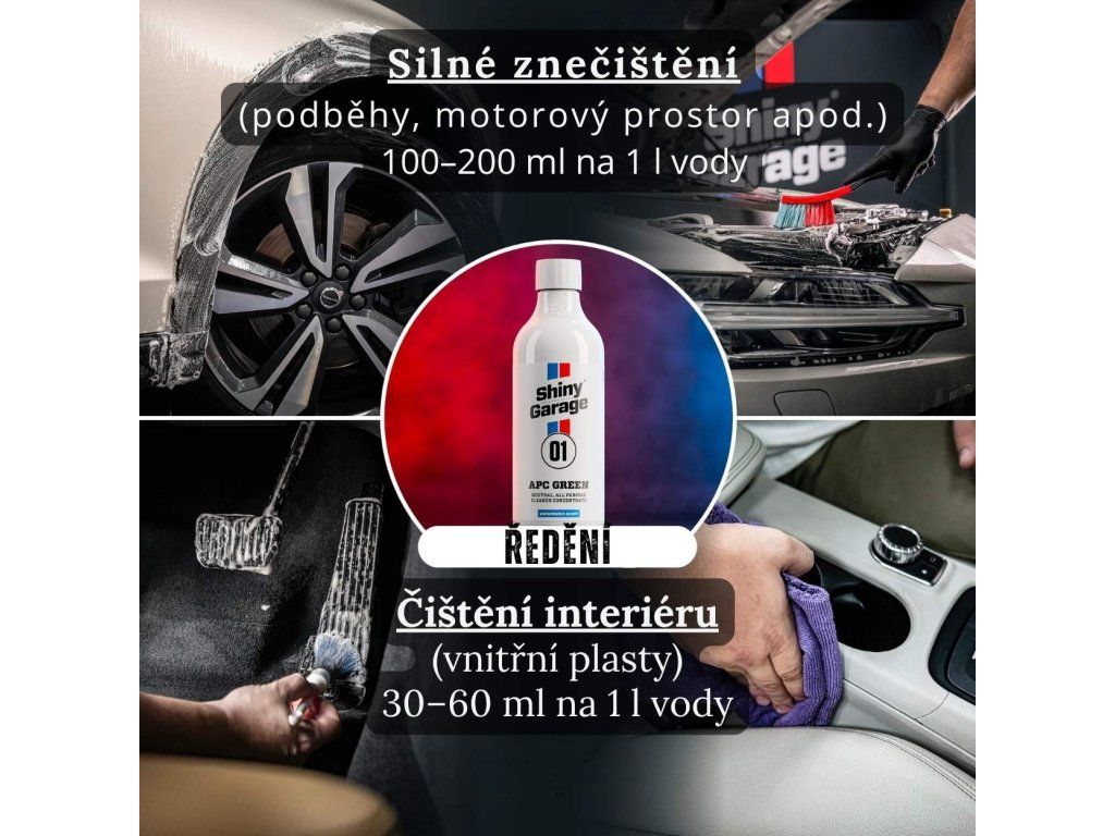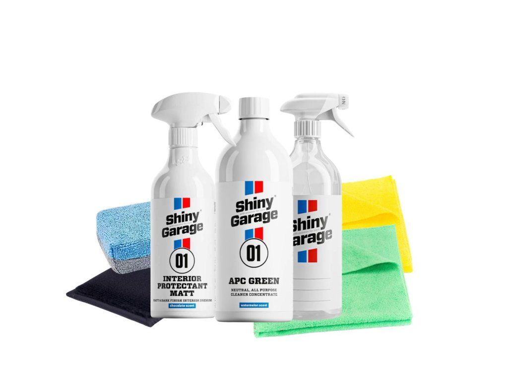 Základem sady je Shiny Garage APC Green, univerzální čistič na běžné nečistoty v interiéru. Díky přiložené mixovací lahvi 1 l je příprava naředěného čističe jednoduchá a pohodlná i pro běžné řidiče.